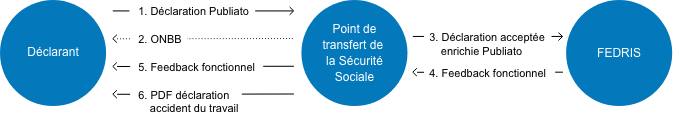 Le 6 janvier 2014, le déclarant titulaire du numéro d’expéditeur 6400 crée un fichier Publiato dans l’environnement de production. Le fichier contient une déclaration. Le point de transfert de la sécurité sociale reçoit le fichier et crée un accusé de réception. Si après contrôles et enrichissements, le point de transfert de la sécurité sociale ne détecte pas d’erreurs, la déclaration est transmise à l’Agence fédérale des risques professionnels (Fedris). Fedris contrôle à son tour la déclaration pour ensuite l’accepter ou la refuser. Le déclarant reçoit alors le feed-back fonctionnel. En cas d’acceptation de la déclaration d’un accident du travail, il reçoit également un PDF.