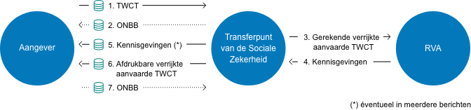 De aangever 6400 maakt op 27 januari 2012 een TWCT-bestand aan in de productieomgeving. Het bestand bevat 4 aangiften TWCT. Het transferpunt van de Sociale Zekerheid ontvangt het bestand op 28 januari 2012, en maakt een ontvangstbewijs aan. Bij het verwerken van de gegevens blijkt dat 2 aangiften blokkerende fouten bevatten. Daarvoor wordt er 30 januari 2012 een eerste notificatiebestand aangemaakt, met daarin twee notificaties. Op 31 januari 2012 wordt een tweede notificatiebestand aangemaakt, dat ook 2 notificaties bevat. Het transferpunt van de Sociale Zekerheid stuurt ook de twee aanvaarde TWCT-aangiften in pdf-formaat terug. Nadat de aangever het notificatiebestand heeft ontvangen, stuurt hij een ontvangstbewijs terug.