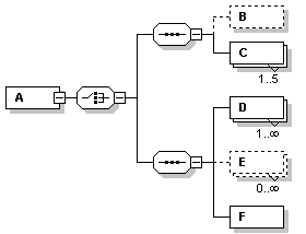 In deze figuur kan element A samengesteld zijn ofwel uit de sequentie van de elementen B en C, ofwel uit de sequentie van de elementen D, E en F.