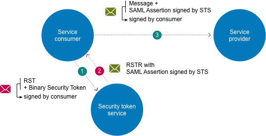 De service consumer stuurt een RequestSecurityToken (RST) naar STS met de vraag om een SAML 1.1-token te verkrijgen. Het verzendernummer wordt als claim gespecificeerd om aan te geven voor welke onderneming en hoedanigheid de service consumer een token wenst aan te vragen. De service consumer tekent de SOAP request volgens de X.509 _SHA256 security policy. Het gebruikte certificaat moet overeenkomen met het certificaat dat voordien opgeladen is in het Toegangsbeheer.